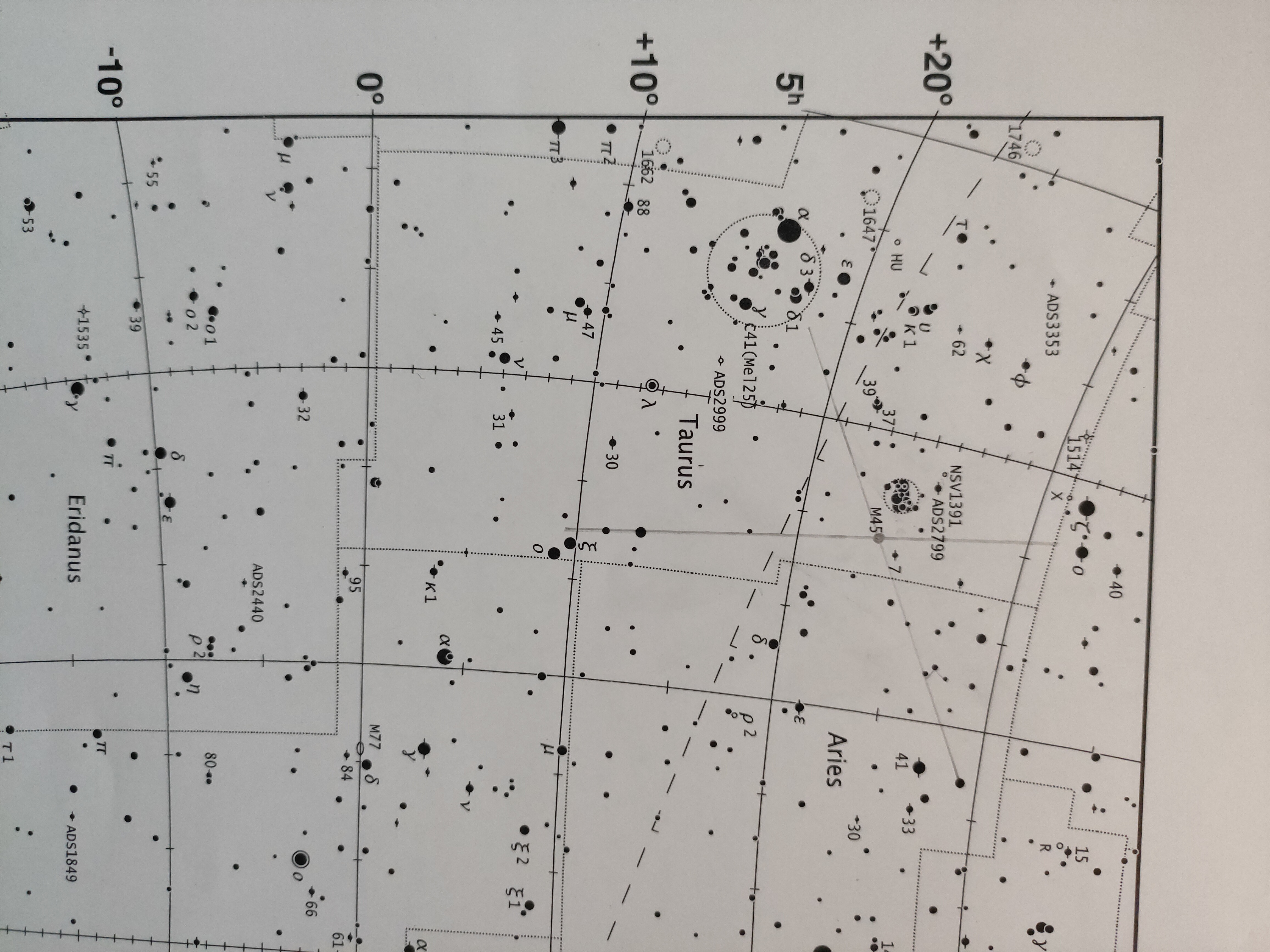 Wyznaczając współrzędne pogrubionego punktu na powyższym zdjęciu otrzymujemy: $$ (\alpha, \delta)=(3^h37^m, 24\degree 20’), $$ co daje praktycznie idealną zgodność w porównaniu z danymi z programu Stellarium.