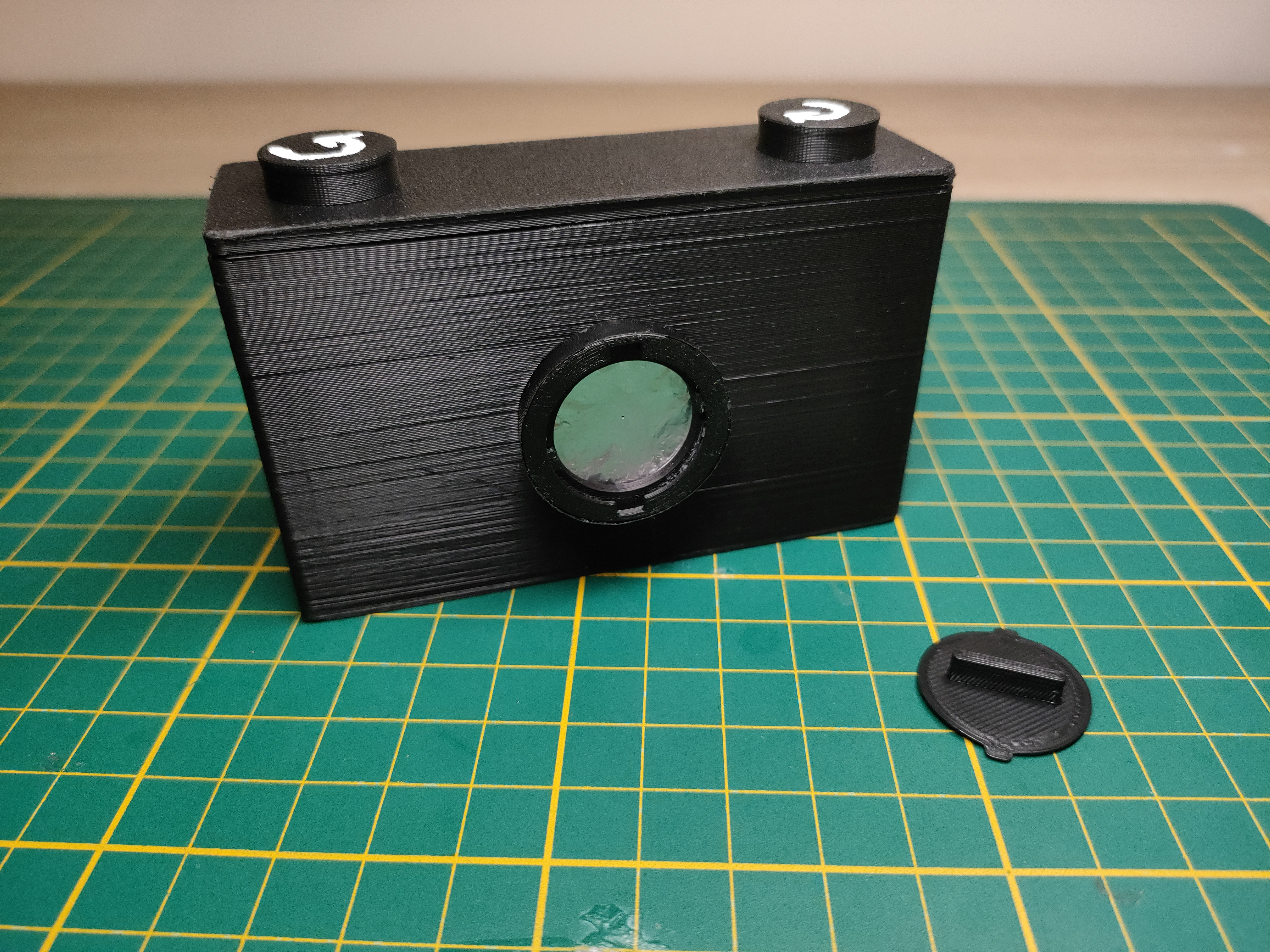 Z puszki należy wysunąć trochę filmu i przykleić go taśmą do rolki. Całość następnie należy włożyć do aparatu i zamknąć go. Pokrywa zamyka się magnetycznie, lecz dla bezpieczeństwa dociskam ją gumkami recepturkami, które również pomagają w trzymaniu pokręteł.