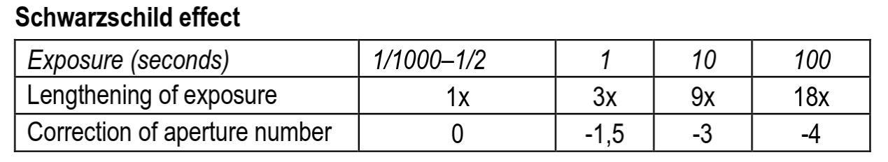 Aby poprawnie naświetlić film, fotografowaną scenę najpierw oglądałem przez aparat telefonu. Po ustawieniu takiego samego ISO, jak kliszy (w moim przypadku 200), ustawiałem odpowiedni czas ekspozycji, $t_t$. Wiedząc, że aparat telefonu ma przesłonę $f/1.8$, mogłem obliczyć ekspozycję aparatu otworkowego ze wzoru $$ t_a=t_t\left(\frac{100}{1.8}\right)^2\approx 3000t_t $$ Należy również wziąć pod uwagę efekt Schwarzschilda. Używany przeze mnie Fomapan 200 miał następującą charakterystykę: