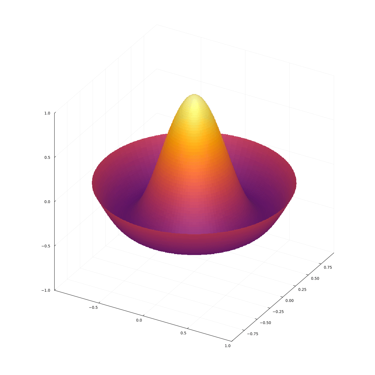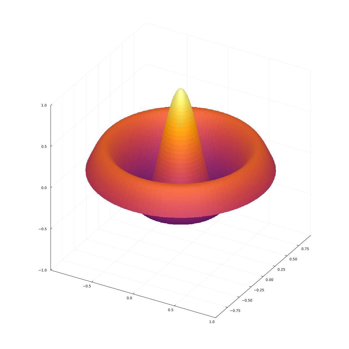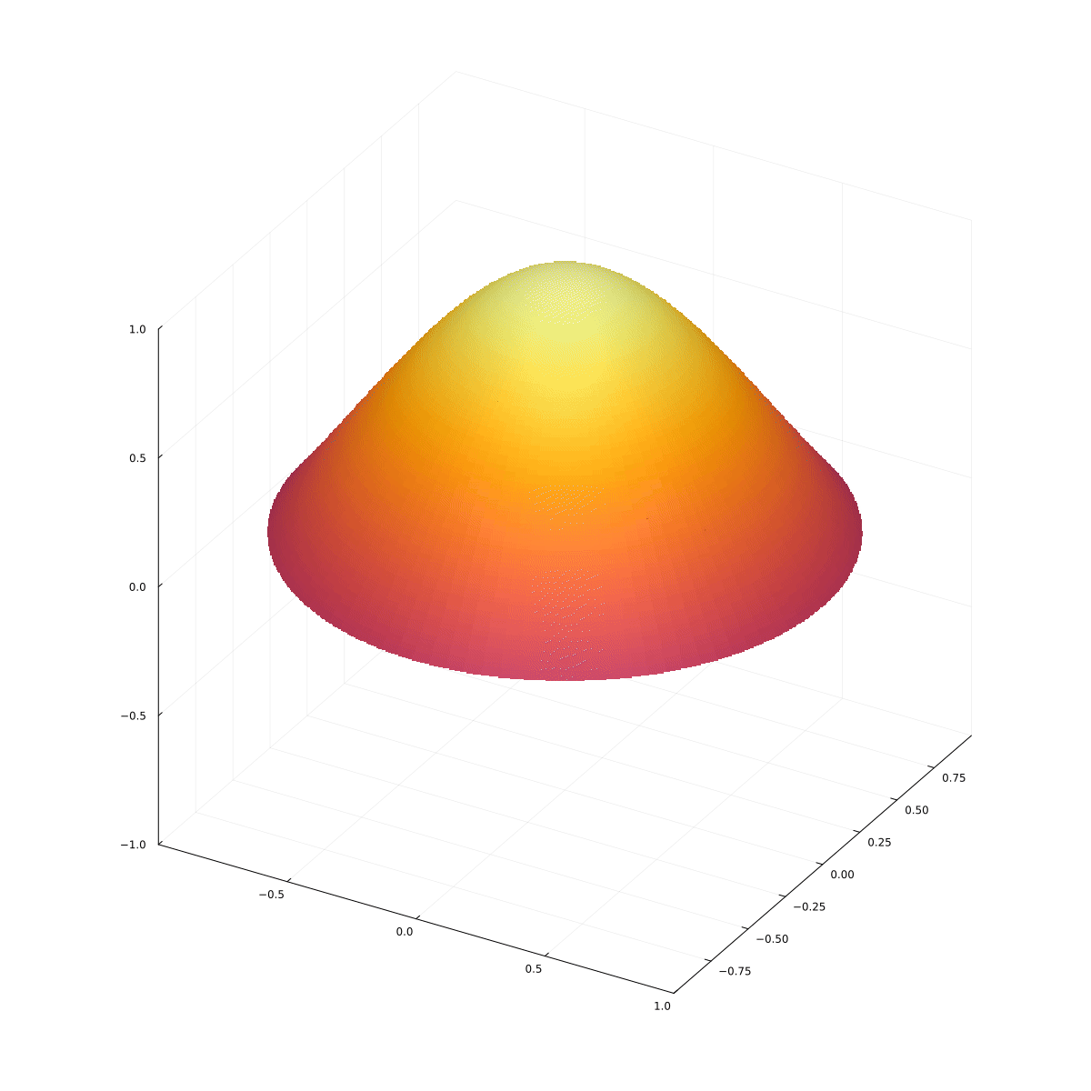 Rozważmy sferycznie symetryczną, płaską membranę, przymocowaną sztywno do pierścienia lub innej okrągłej krawędzi i wykonującą drgania. Membrana leży w jednej płaszczyźnie, więc problem nie zależy od współrzędnej $z$. Rówanie falowe dla membrany będzie miało postać: $$ c^2 \nabla^2 u = \frac{\partial^2 u}{\partial t^2} $$ z warunkiem brzegowym $u(R)=0$, gdzie $R$ to promień membrany (jest ona przymocowana). Laplasjan we współrzędnych biegunowych to $$ \nabla^2 u = \frac{1}{r} \frac{\partial}{\partial r}\left( r \frac{\partial u}{\partial r}\right) + \frac{1}{r^2} \frac{\partial^2 u}{\partial \theta^2}, $$ więc $$ \frac{1}{c^2} \frac{\partial^2 u}{\partial t^2}=\frac{1}{r} \frac{\partial}{\partial r}\left( r \frac{\partial u}{\partial r}\right) + \frac{1}{r^2} \frac{\partial^2 u}{\partial \theta^2}, $$ gdzie $\theta$ to kąt biegunowy.