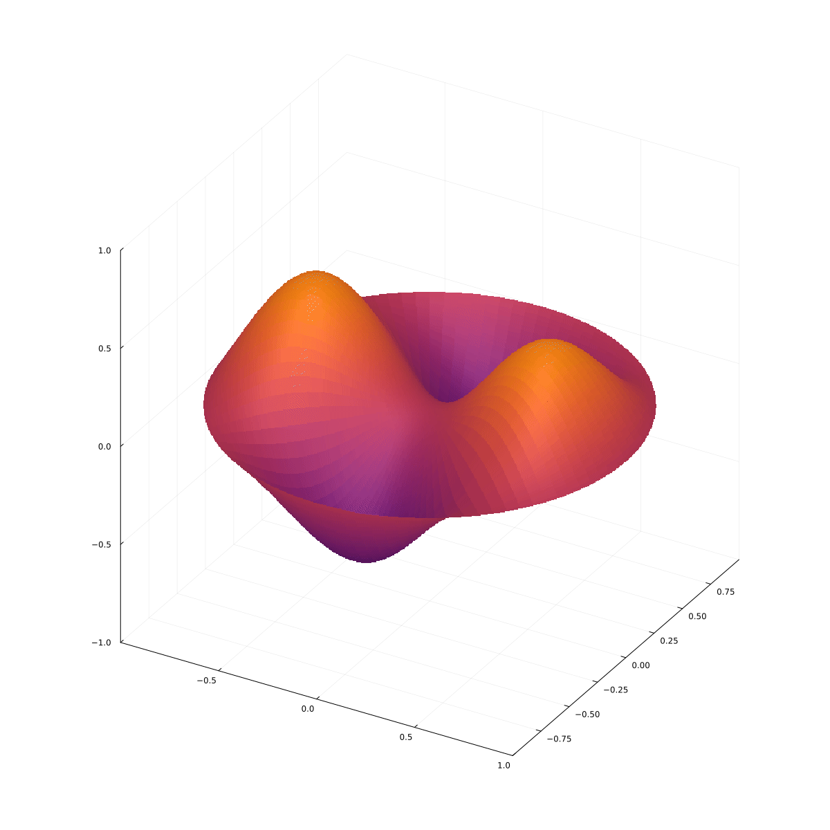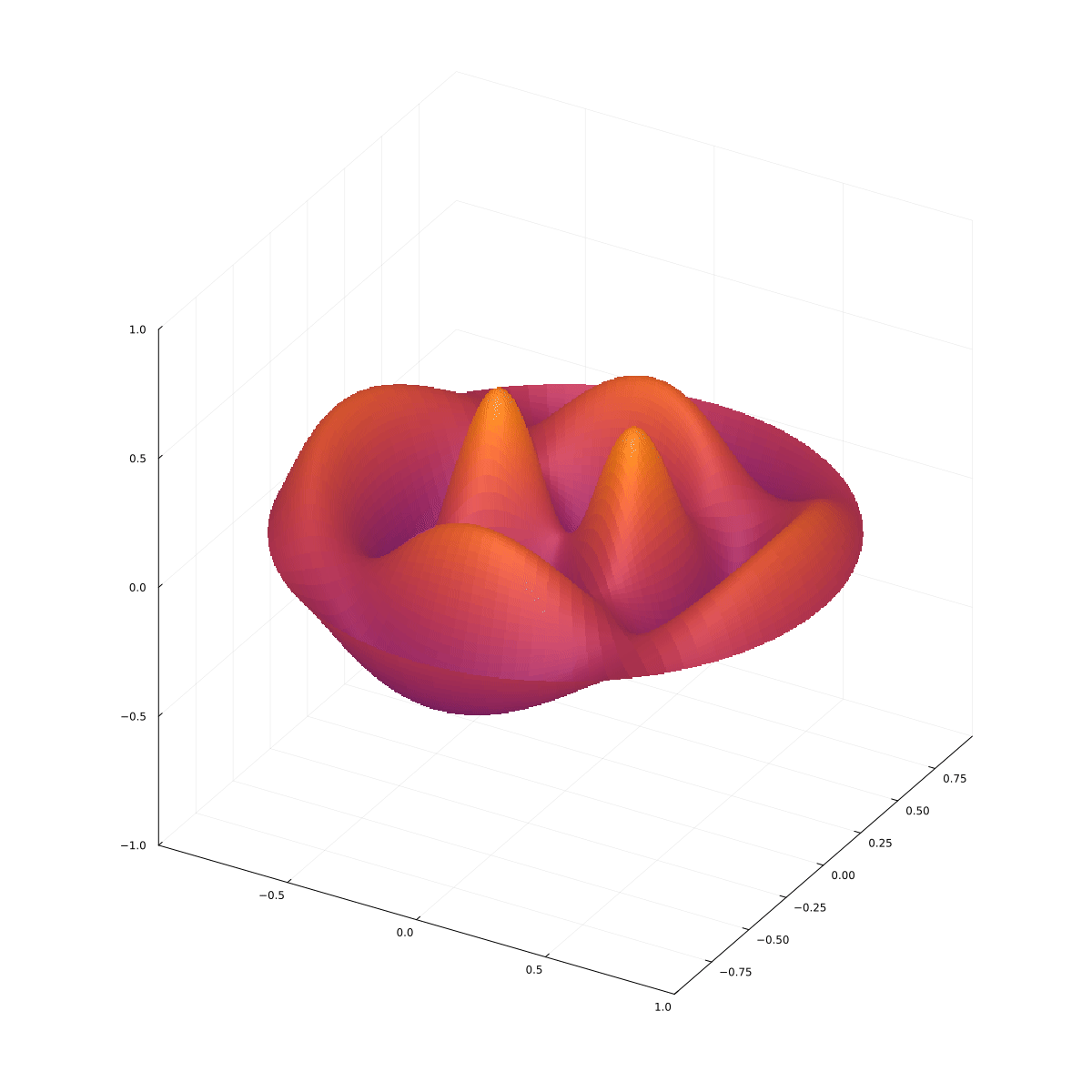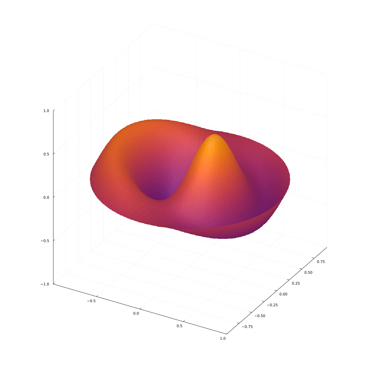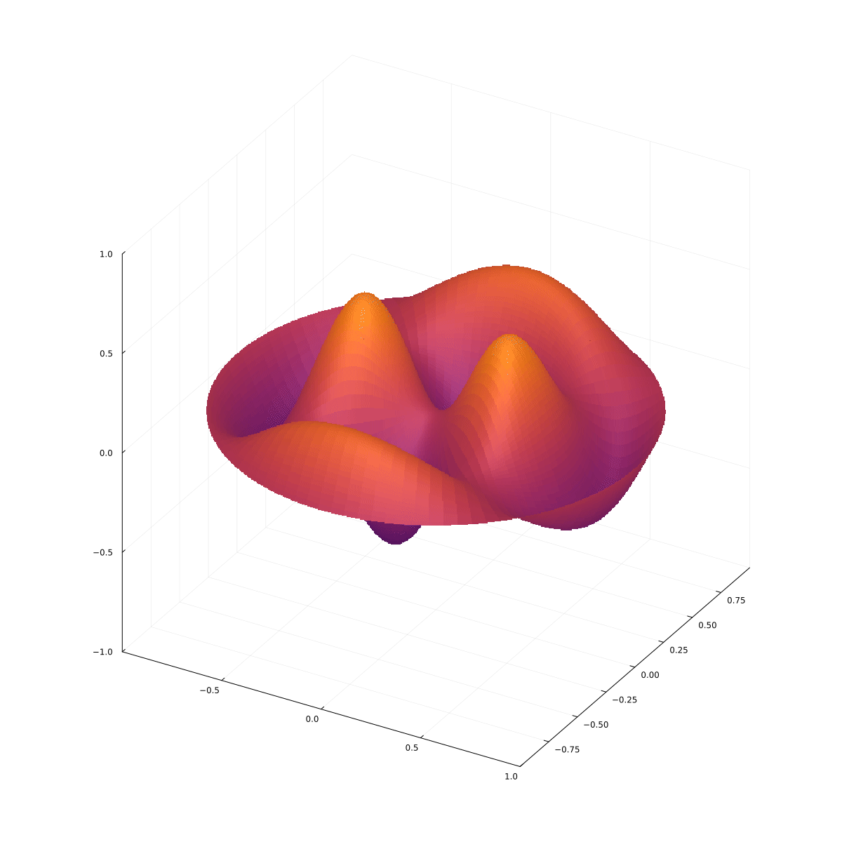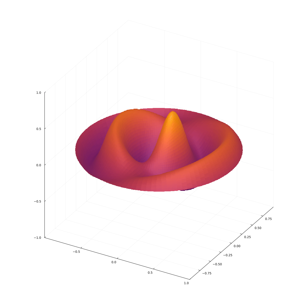Rozwiązanie to zatem: $$ u(r, \theta, t) = A\cos(c\lambda t)\cos(\alpha\theta) J_\alpha(\lambda r), $$ gdzie chwilę początkową wybieramy tak, aby $B=0$ oraz wszystkie stałe łączymy w jedną. Pozostaje nam warunek brzegowy: $$ u(R, \theta, t)=0, $$ więc $$ J_\alpha(\lambda R)=0. $$ Zastąpmy $\alpha$ przez $m$. Jako $\alpha_{mn}$ oznaczymy $n$-te miejsce zerowe $J_n(x)$. Wtedy $$ \lambda R=\alpha_{mn}, $$ skąd $$ \lambda = \frac{\alpha_{mn}}{R}. $$ Ostateczne rozwiązanie to: $$ \boxed{ u_{mn}(r,\theta, t)=A\cos\left( \frac{c\alpha_{mn}}{R}t\right)\cos(m\theta)\, J_m\left( \frac{\alpha_{mn}r}{R}\right).} $$ Są to mody normalne cylindrycznej membrany. Kilka modów normalnych jest przedstawionych na poniższych animacjach.